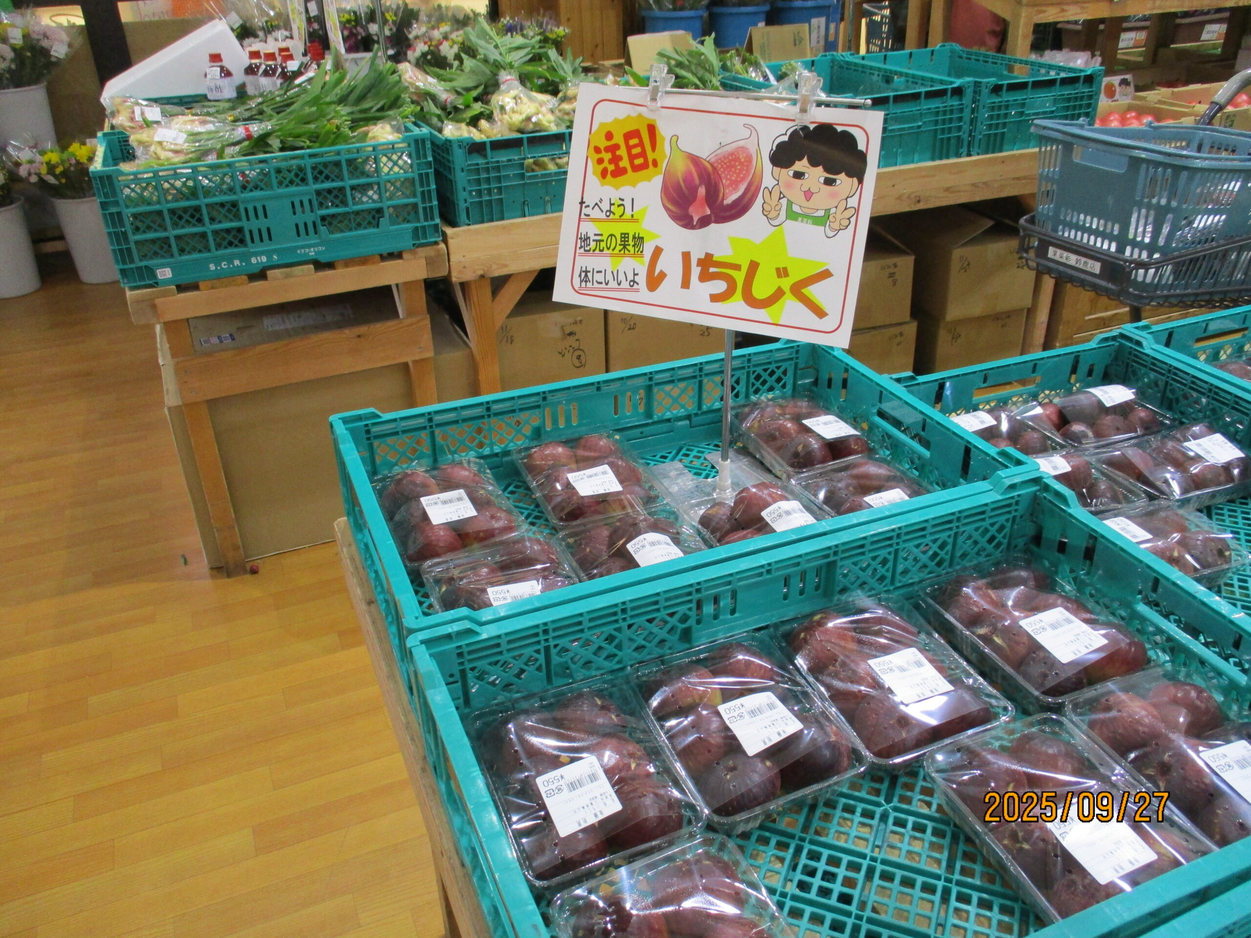地元鈴鹿でとれた「いちじく」「ぶどう」「さつまいも」「葉しょうが」「かぼちゃ」「キュウリ」「なす」「ピーマン」「切花」「仏花」「じゃがいも」などの