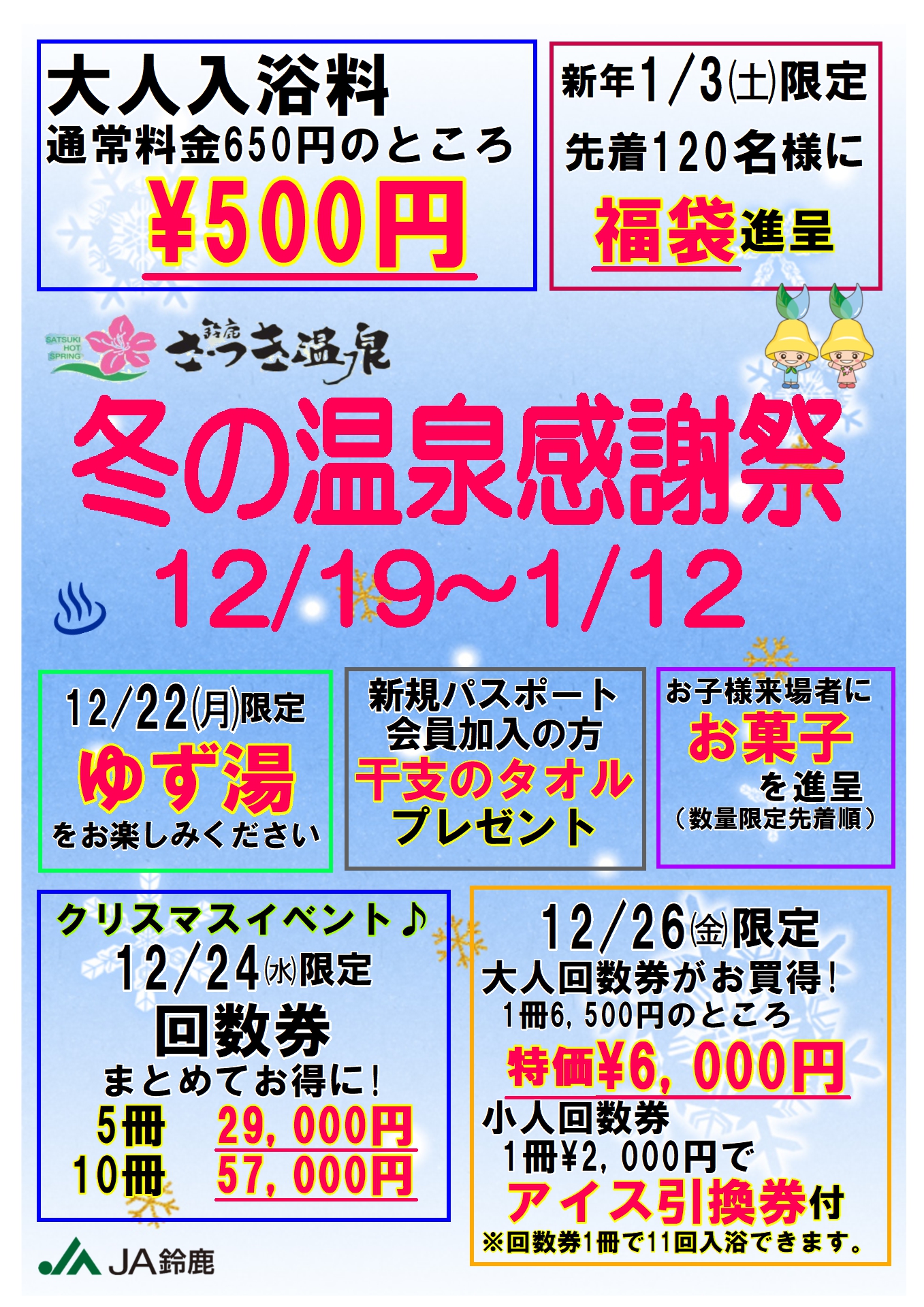 鈴鹿さつき温泉では、12/19(金)~1/12(月)までの期間限定イベントとして「冬の温泉感謝祭」を開催します。