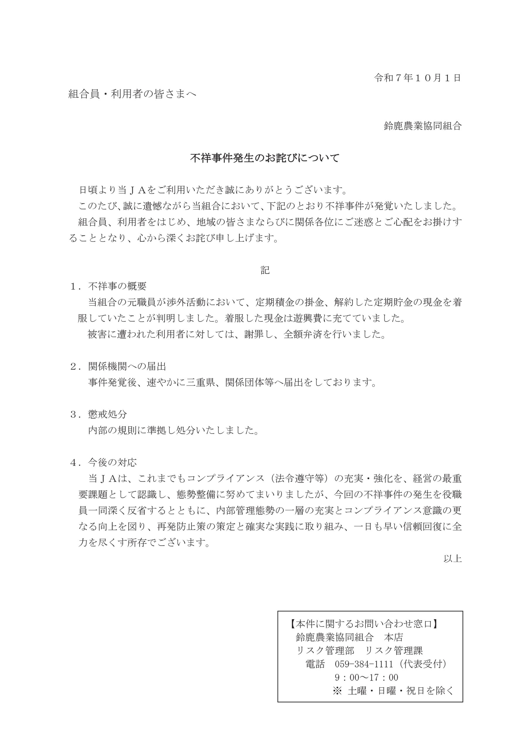 不祥事件発生のお詫びについて