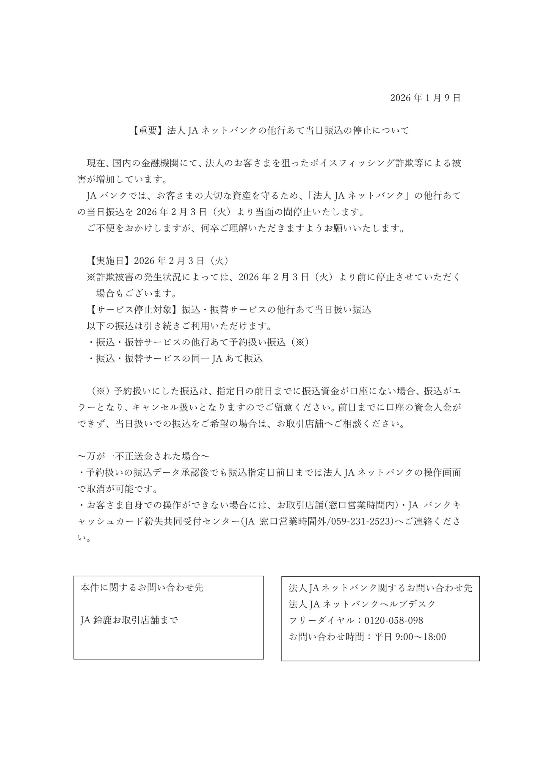 法人JAネットバンクの他行あて当日振込の停止について