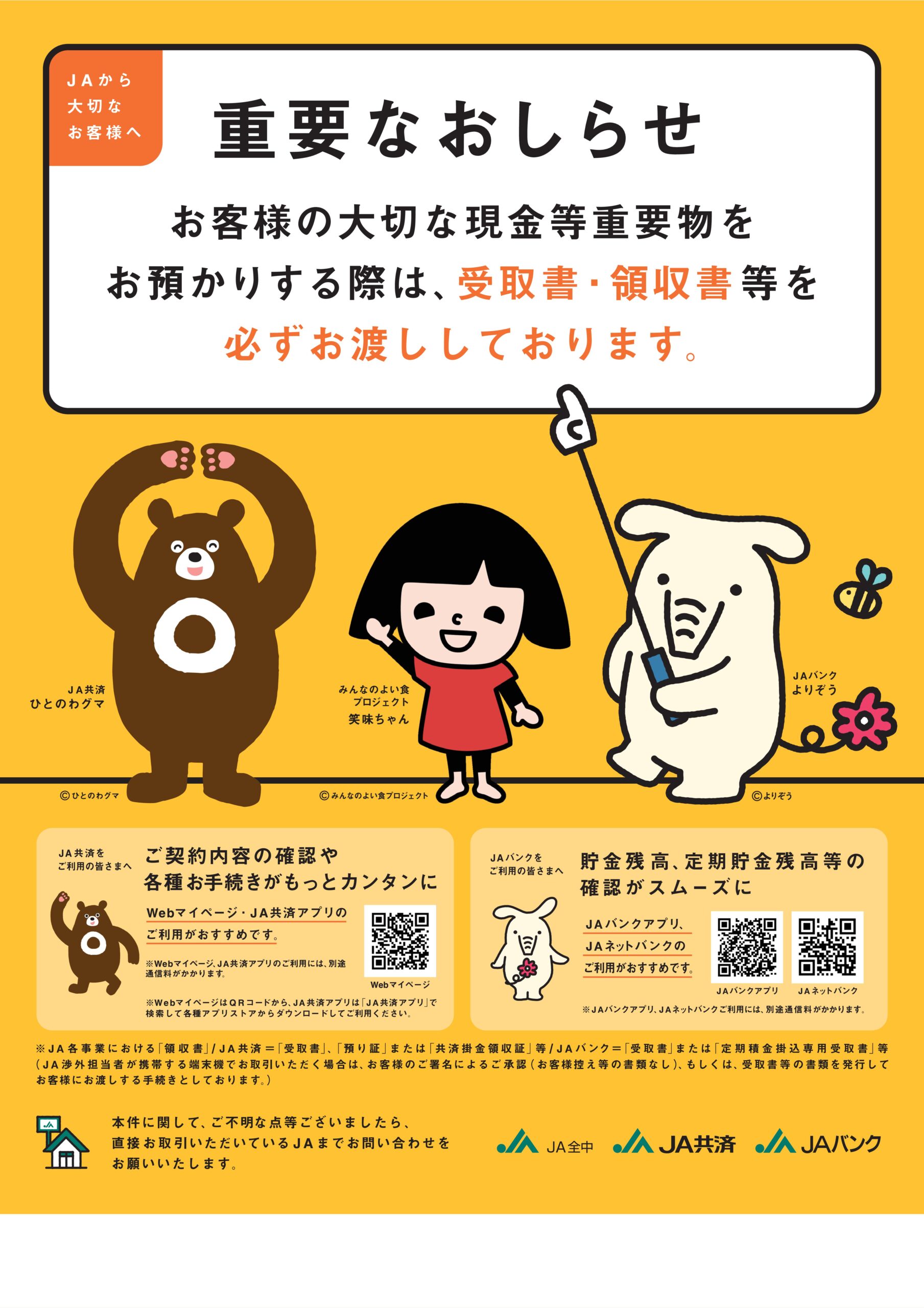 【重要なおしらせ】現金等重要物をお預かりする際の受取書・領収書等のお渡しについて