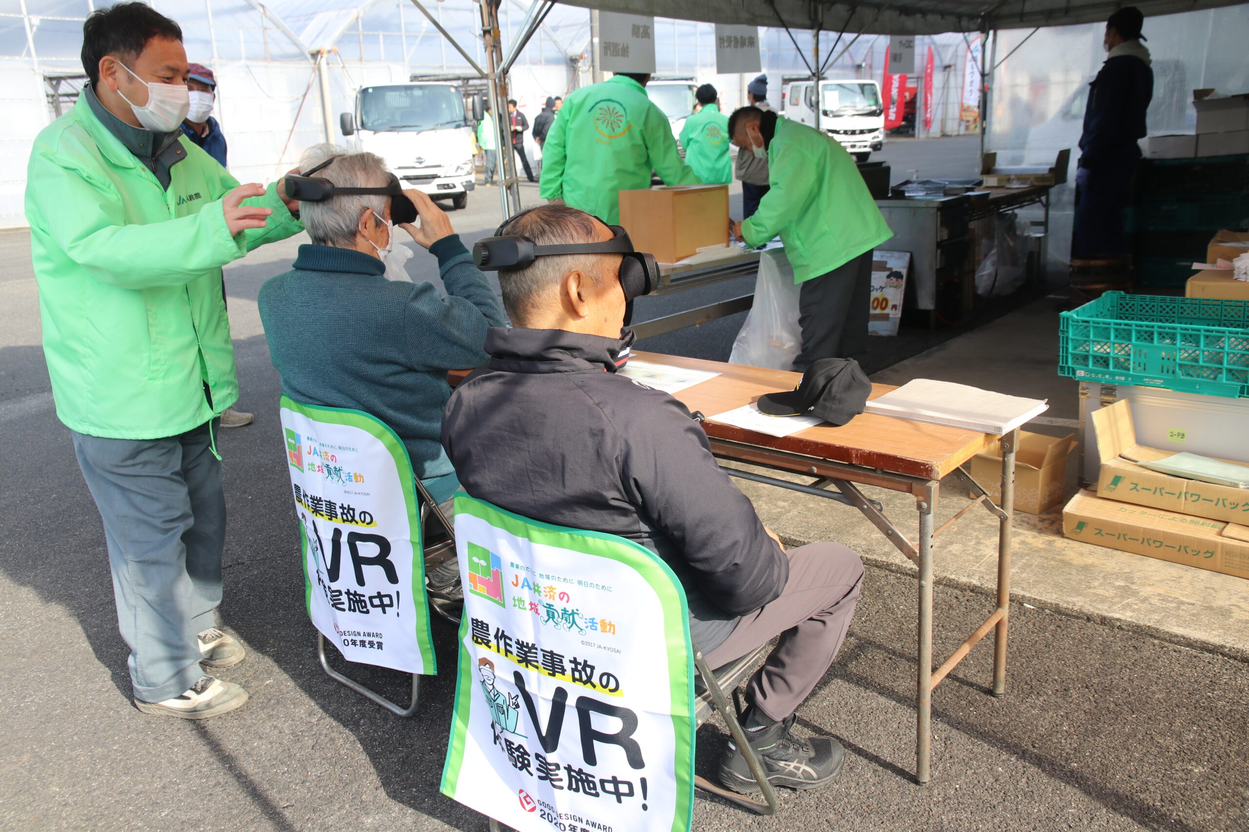 会場には最新の農業機械、お買い得な中古農機、自動車、生活用品、農業用・生活用資材を展示し、JA職員や各メーカー担当者が特徴などを説明しました。また、JA共済連三重の協力のもと農作業事故を未然に防ごうとVRゴーグルを活用した事故の疑似体験ブースを初めて設置し事故啓発に努めたほか、小農機具点検整備会を同時開催し会場で点検整備を行い、使用方法の確認を行いました。農業資金や農機レンタルなどのブースも設置し、相談を通して組合員との対話を行いました。