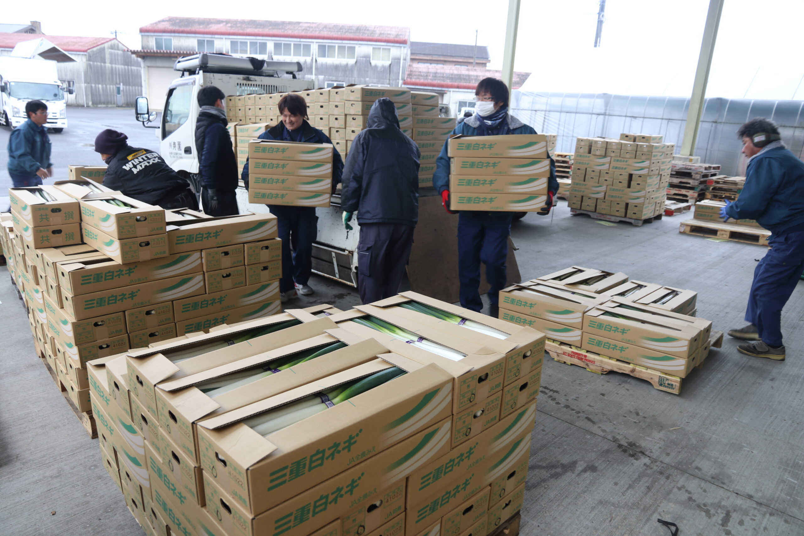12月下旬から1月上旬にかけてJA鈴鹿白ネギ部会による白ネギ出荷がピークを迎えました。出荷は鈴鹿市津賀町の西部カントリーエレベーター青果物集出荷場で行われ、今年度は300㌧の出荷を目指しています。長引いた夏の暑さの影響で収量の減少は見られたものの、白ネギの品質は良好で出荷も順調に続きました。